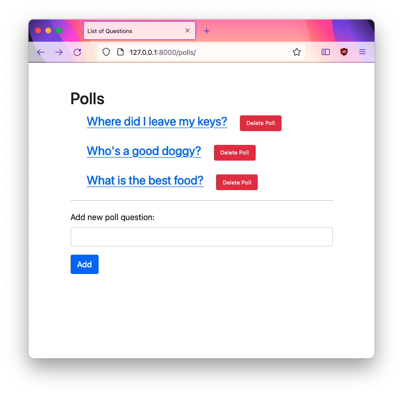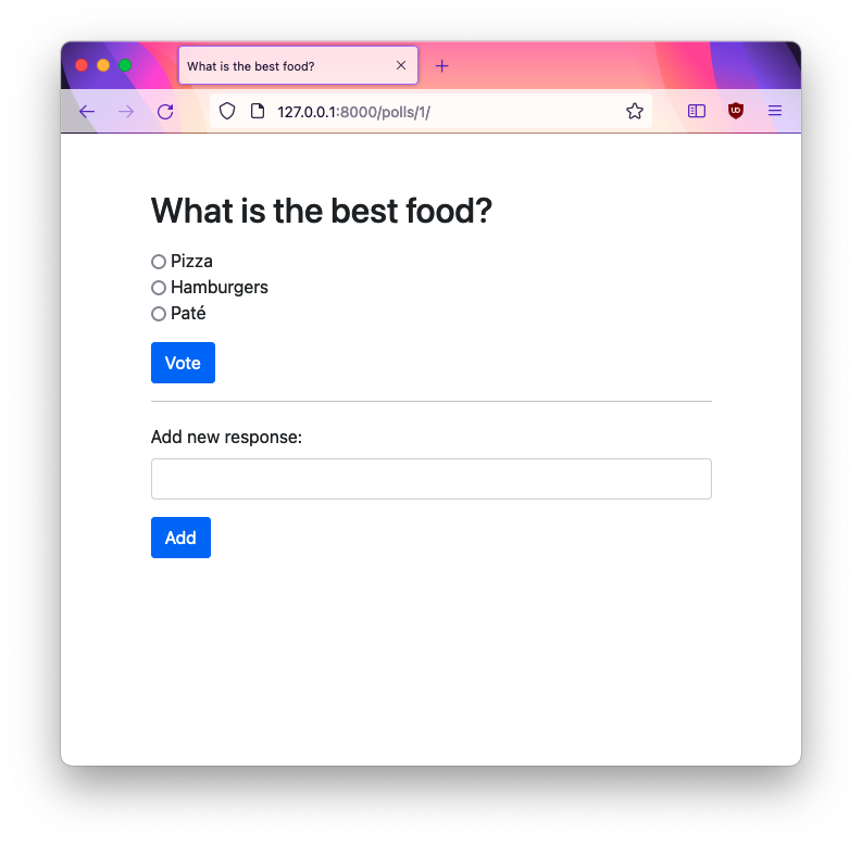 refresh the page (refreshing the page can be accomplished with a view that returns a RedirectResponse)polls.views.DetailView) there should be an empty text form field with a button to add a new choice to the poll.