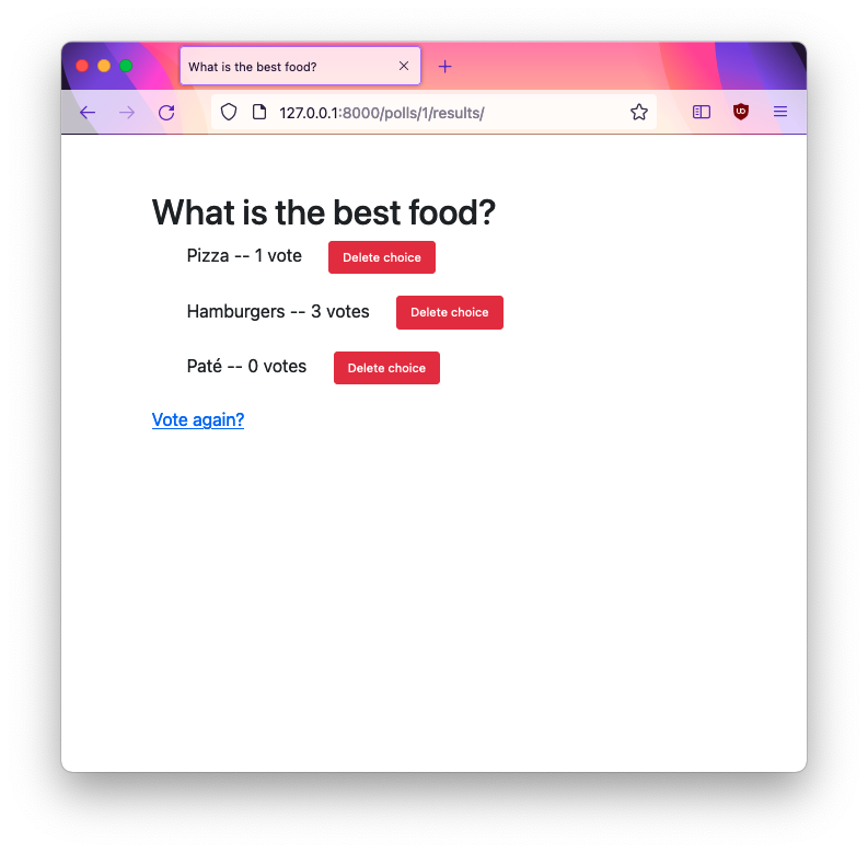 When clicked, this should refresh the page, showing the poll with the new chocie added.polls.views.ResultsView) each response should have a "remove" button after it. Clicking that button will remove the response from the database and